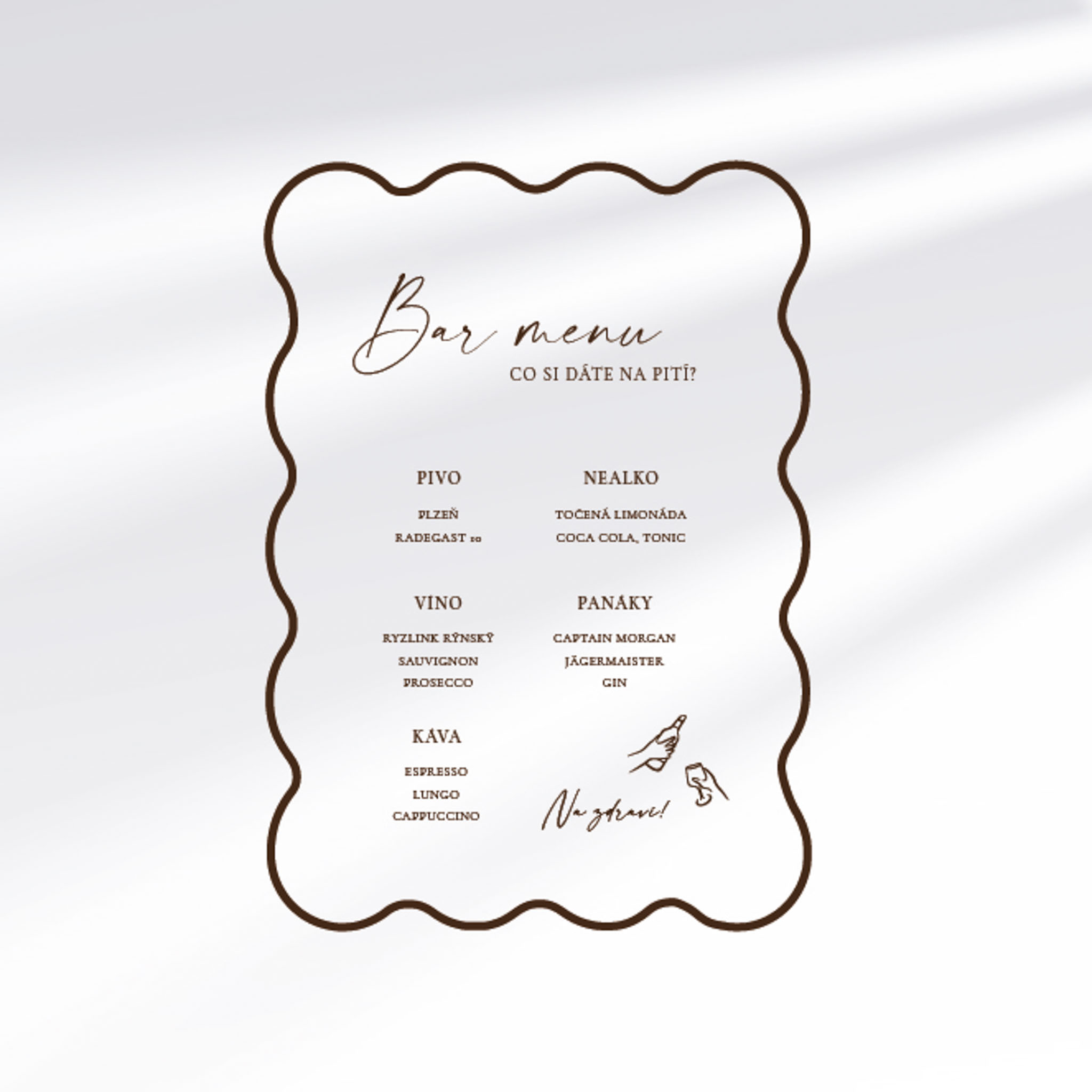Tištěná prezentace nápojového lístku a samotných nápojů je důležitá, aby každý host věděl, co si může dát nebo co platíte vy – v případě, že lze na baru objednat i jiné nápoje, než máte domluvené.